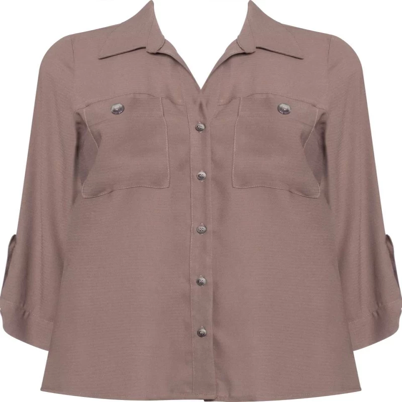 Possui bolsos no busto com fechos em botões